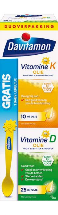Davitamon Baby Eerste Vitamines is een duoverpakking met daarin vitamine D olie en vitamine K olie. Al vanaf de geboorte zijn vitamines en mineralen belangrijk voor de gezondheid van je baby. Vitamine D en K spelen hierbij een bijzondere rol. Zo is vitamine D belangrijk bij de groei en ontwikkeling van de botten, de opbouw van sterke tanden en goed voor de weerstand. Vitamine K draagt bij aan een goed verloop van de bloedstolling. De Gezondheidsraad adviseert aan baby’s die borstvoeding krijgen dagelijks extra vitamine D en K te geven.