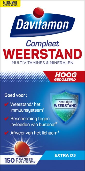 Davitamon Compleet Weerstand Forte is een hoog-gedoseerde complete multivitamine met mineralen voor volwassenen. Voor een goede weerstand is het belangrijk dat je dagelijks voldoende van bepaalde vitamines en mineralen binnenkrijgt. Davitamon Compleet Weerstand Forte bevat ter aanvulling op de voeding alle belangrijke vitamines en mineralen en heeft een positieve invloed op de weerstand. Dit geeft extra ondersteuning bijvoorbeeld bij lichamelijke inspanning of in herstelperiodes, of als dagelijkse aanvulling.