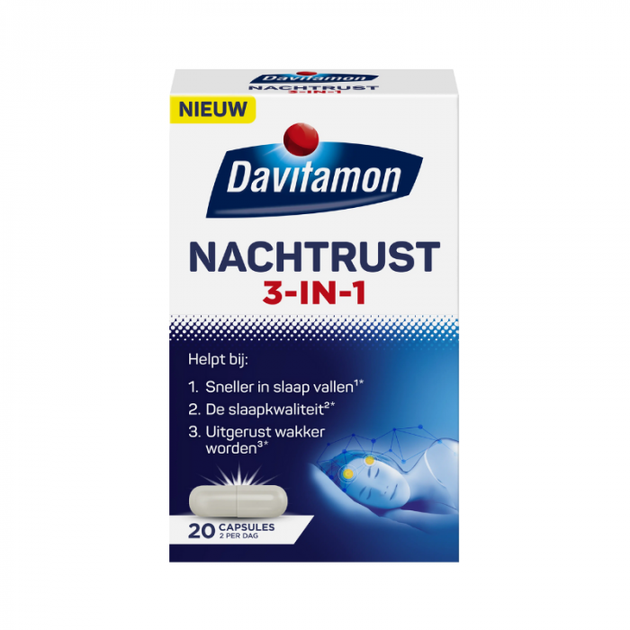 Davitamon Nachtrust 3-in-1 ondersteunt slaap door te helpen sneller in slaap te vallen, de slaapkwaliteit te verbeteren en uitgerust wakker te worden met natuurlijke extracten en melatonine.