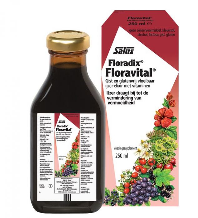 Floradix is een vloeibaar ijzer-elixir aangevuld met groente-extracten en vruchtenconcentraten.