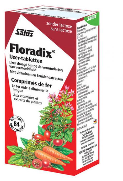 FLORADIX® ijzer-tabletten, verrijkt met vitaminen, groente-extracten en vruchtenconcentraten en foliumzuur. FLORADIX® bevat een goed opneembare en goed verteerbare vorm van ijzer en biedt ook belangrijke voedingsstoffen zoals B-vitamines (waaronder Foliumzuur). Het ijzer draagt bij aan de vermindering van vermoeidheid.