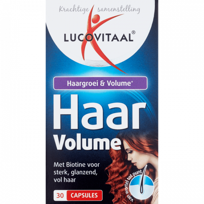 Lucovitaal Haar Volume Capsules bevatten een unieke verzorging voor je haar. De capsules verzorgen je haar van binnenuit met gehydroliseerde keratine. De formule bevat Ledebouriella Seseloides wat de haargroei onderstent. Daarnaast bevat deze formule verschillende B-vitaminen, koper, seleen en zink. Vitamine B2 helpt de cellen beschermen tegen oxidatieve schade door uv-straling. Koper draagt bij tot de normale pigmentatie van het haar. Biotine en seleen dragen bij aan een normale haargroei en zorgen voor sterk en glanzend haar. Zink is goed voor je haar, nagels en is daarnaast belangrijk voor de huid.