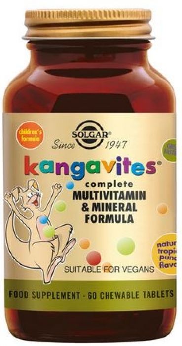 Solgar Kangavites™ Tropical Punch is een multi-vitaminen/mineralencomplex voor peuters en kleuters. Solgar Kangavites™ voorziet in de basisbehoefte aan vitaminen en mineralen.