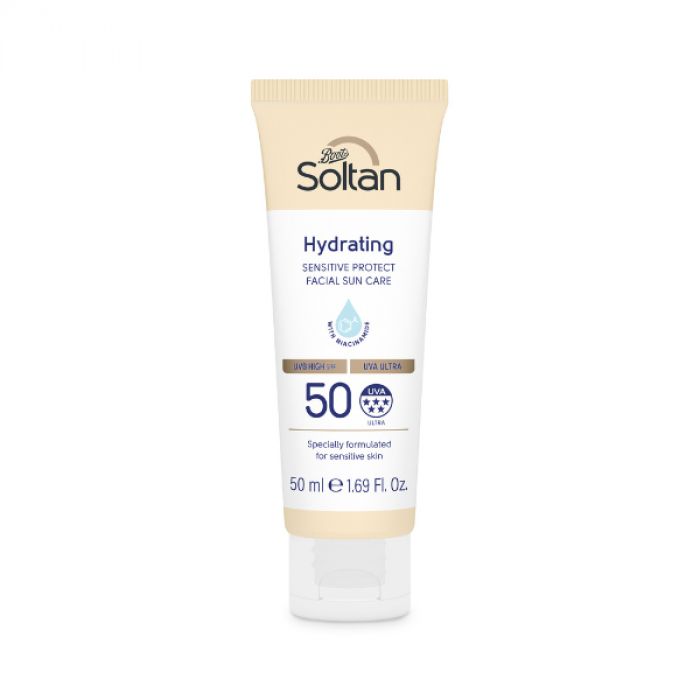 Soltan Gezicht Gevoelige Huid Creme SPF50+ biedt expert bescherming voor gevoelige huid met UVA/UVB-bescherming. Verrijkt met Niacinamide voor hydratatie.