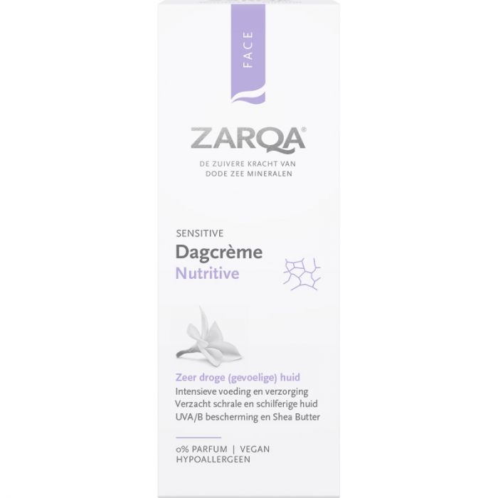 ZARQA Dagcrème Nutritive is een rijke, volle dagcrème die de droge tot zeer droge (gevoelige) huid intensief voedt. Dode Zee-mineralen, hyaluronzuur, macadamiaolie, sheaboter en vitamine E helpen bij het verzachten en ondersteunen van ruwe, schrale en schilferige plekken. De crème biedt krachtige bescherming tegen uitdroging en schadelijke externe factoren, zoals UV-straling en luchtverontreiniging. Het maakt de huid zacht en soepel.